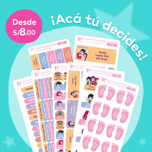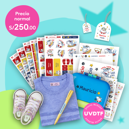 286 etiquetas: 144 etiquetas super resistentes para objetos, 40 etiquetas para ropa, 30 para cuaderno, 57 etiquetas UVDTF para decorar, 15 para cumpleaños, 1 mochitag grande, 1 mochitag chico y 1 minitag.