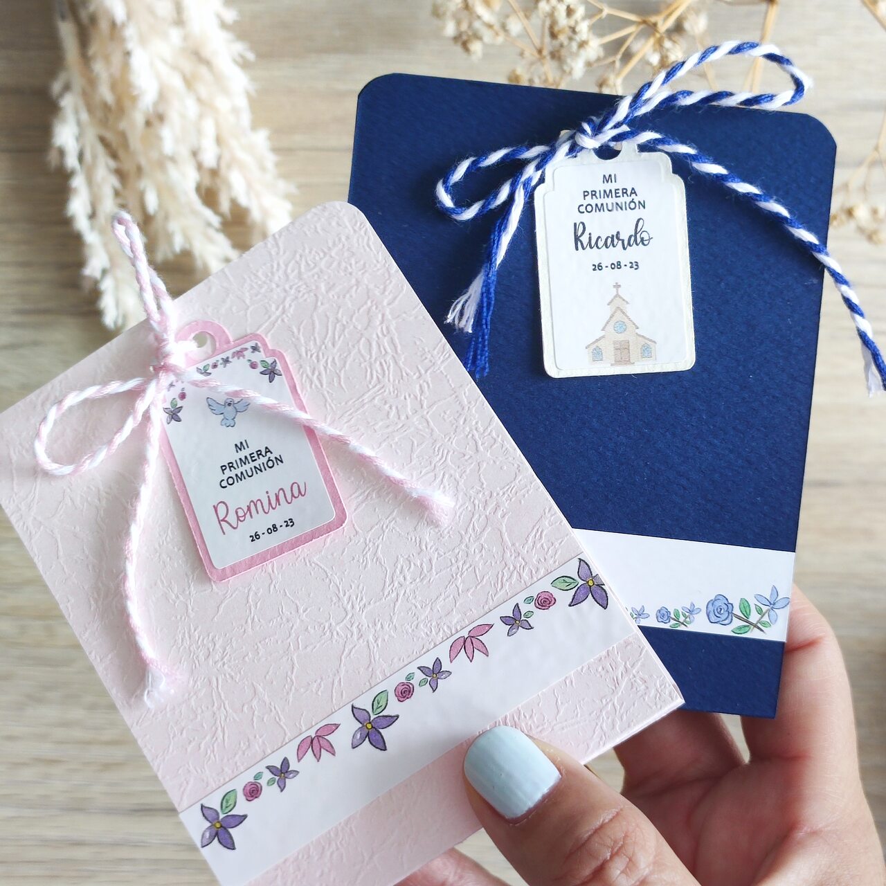 Viene con una bolsita y un tag de acuerdo al diseño de la estampita