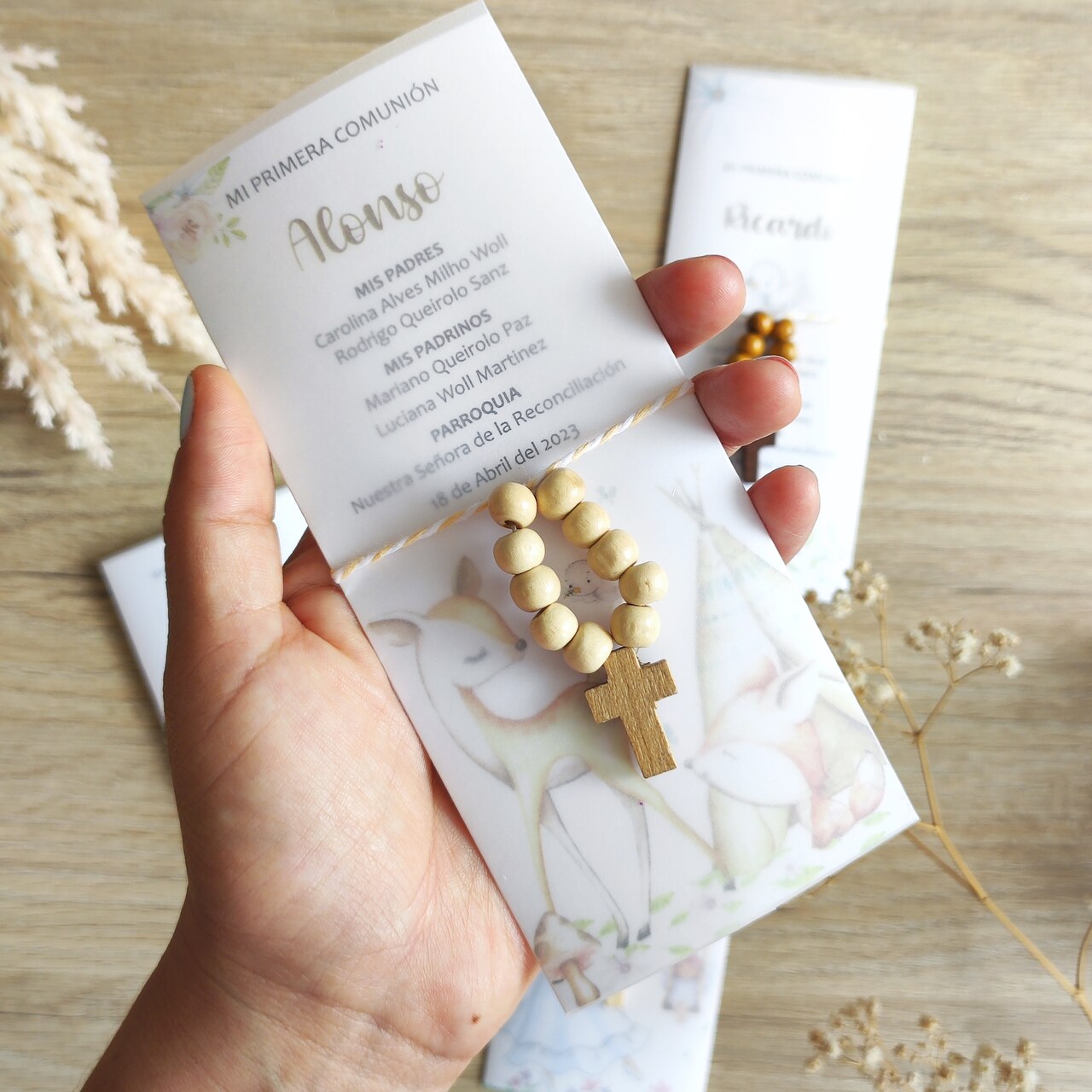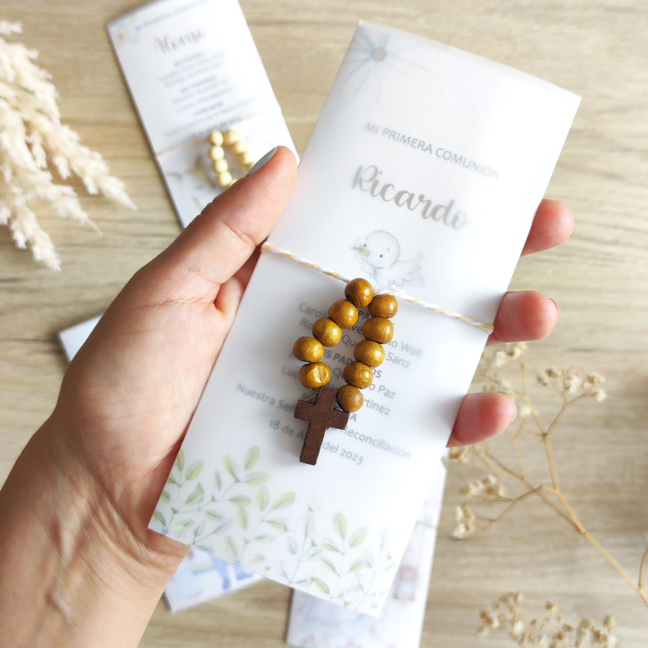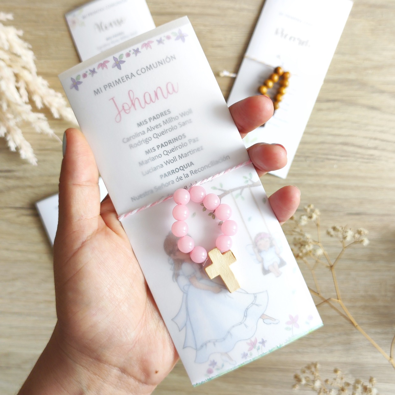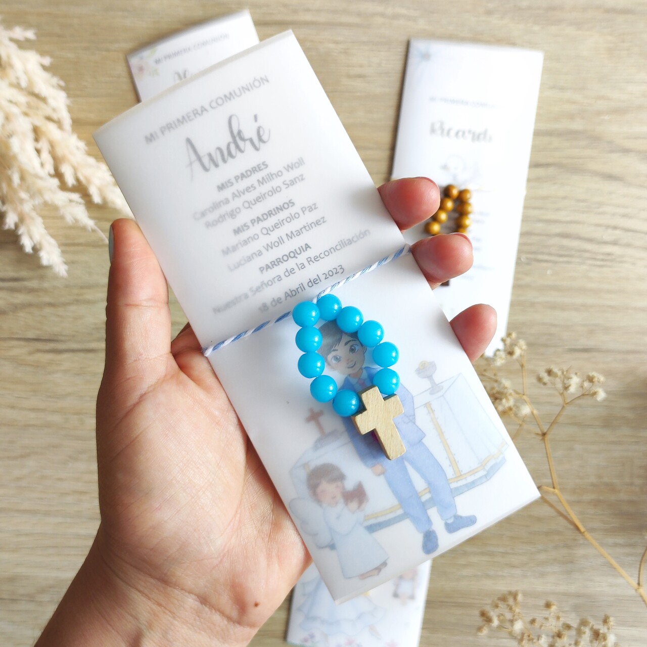El Set 1-Estampita + Denario consta de una pequeña estampita con el diseño que más te guste dentro de nuestras categorías, la estampita se puede colocar en un marco o en un lugar especial de la casa como recordatorio de la primera comunión. También incluye un denario, que es un rosario de diez cuentas que se usa para rezar y meditar.