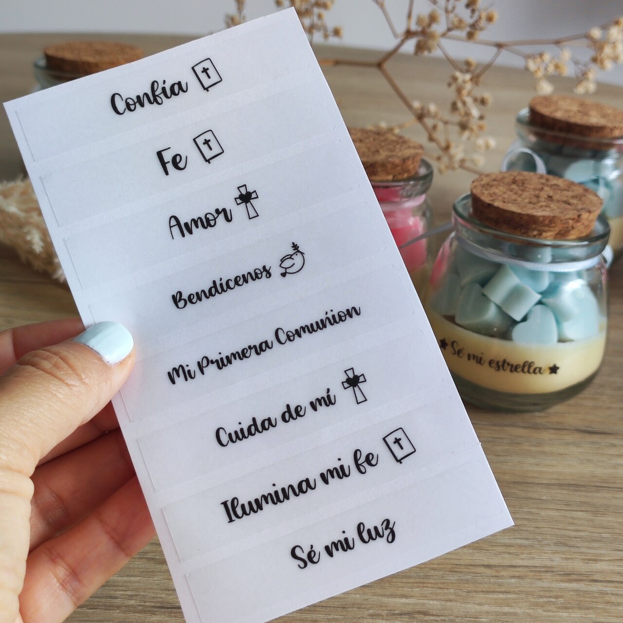 Tag con el diseño de la estampita y donde irán los datos de la celebración.
