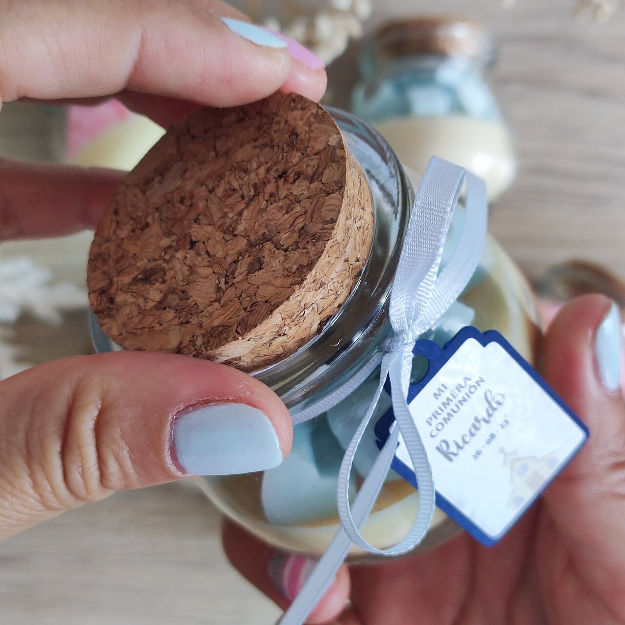Las velas están en unas botellitas hechas de vidrio incluye su tapa de corcho.