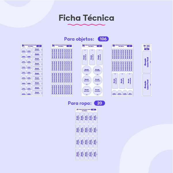 Contiene 126 etiquetas: 106 etiquetas para objetos y 20 etiquetas termo-adhesivas para ropa.
