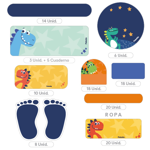 Contiene 124 etiquetas: 99 etiquetas para objetos y 20 etiquetas termo-adhesivas para ropa y 5 etiquetas adhesivas para cuaderno.